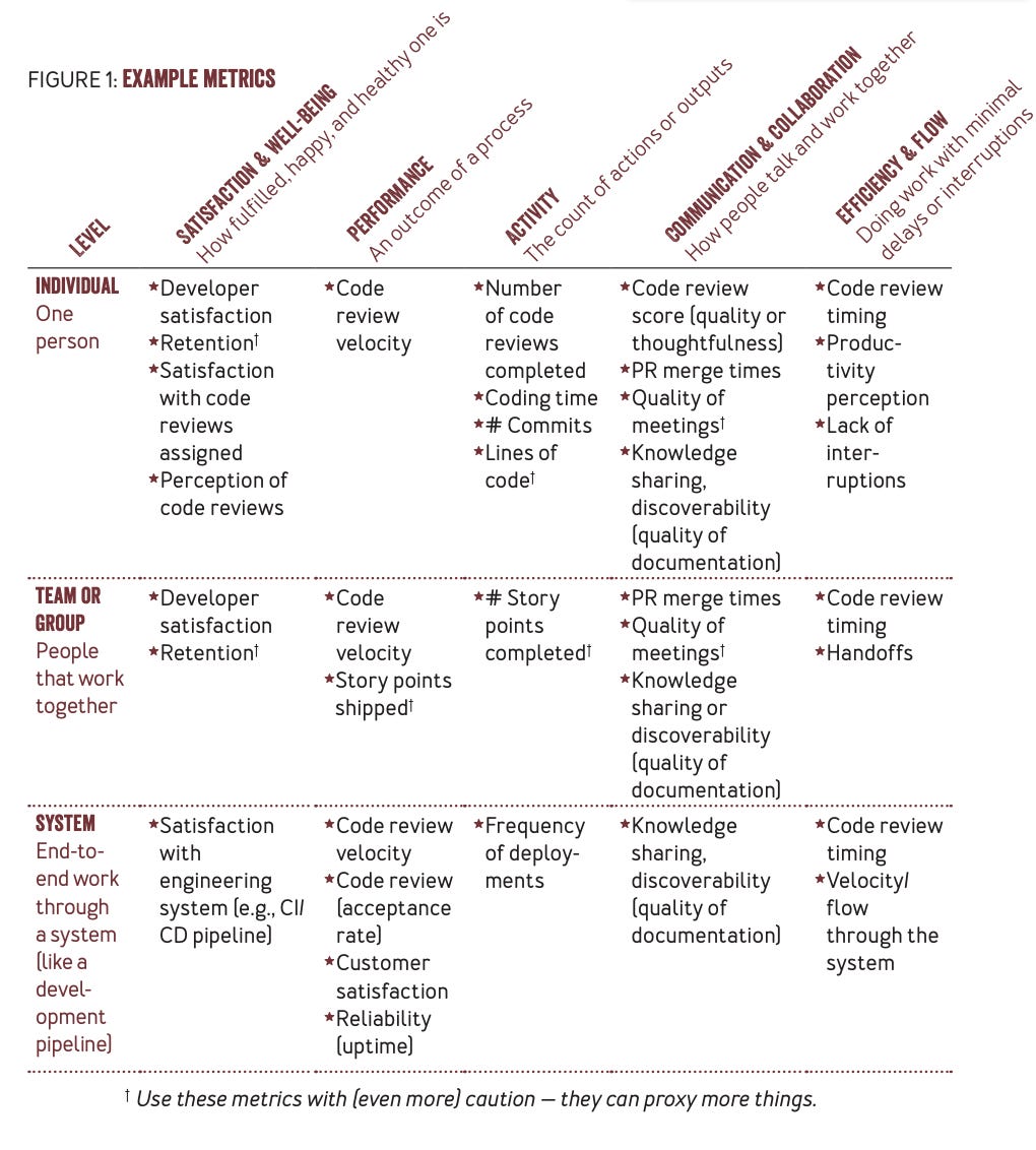 Satisfaction and well-being - this is incredibly important and often overlooked. A developer may be making record number of commits but inching towards burnout leading to poor productivity or they may even quit.