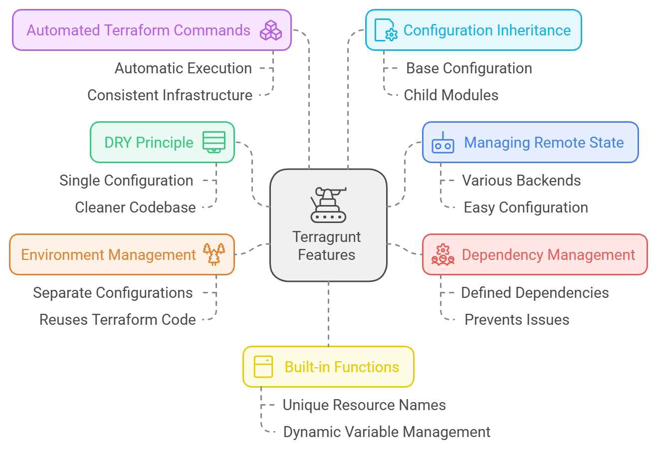 Provides features like remote state management, input variable validation, and automated dependency management