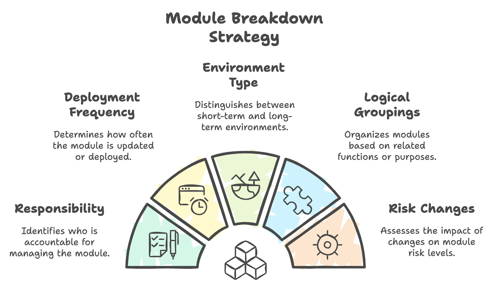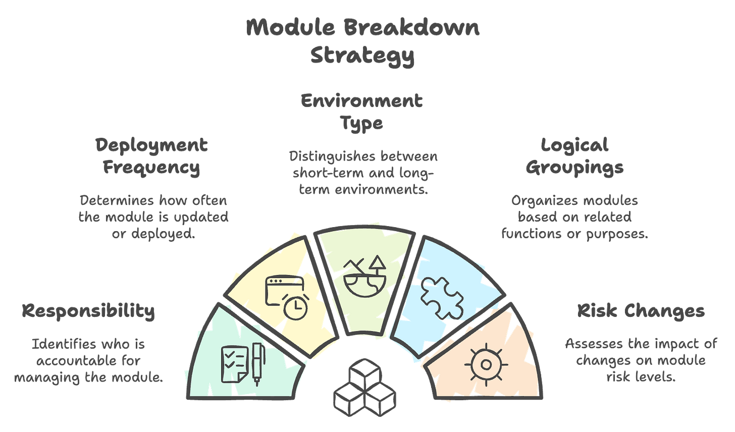 Risk-related changes (ex. a networking/security change may be a higher risk and should be in a different module compared to frequently changes application resources)
