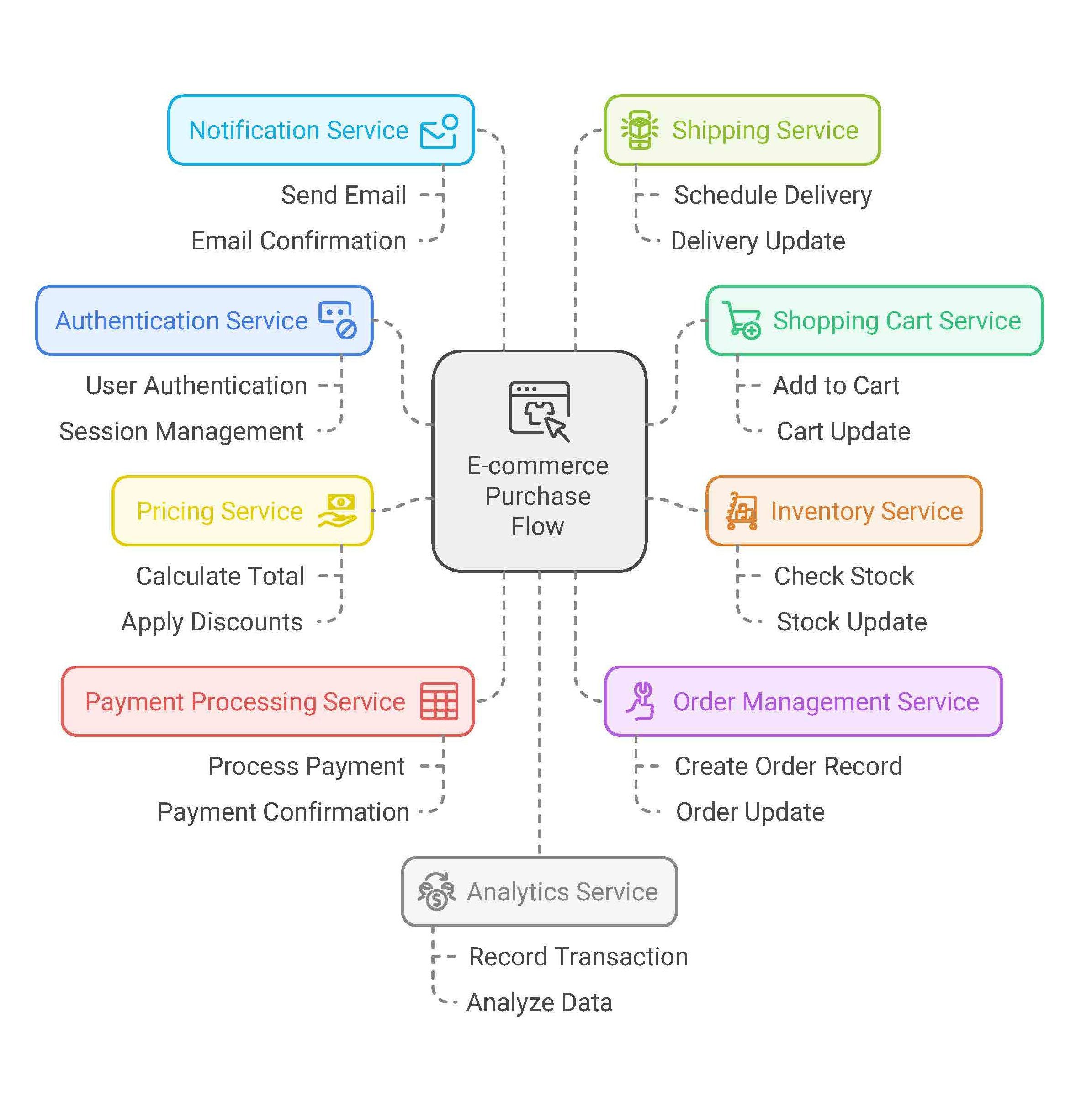 The user proceeds to checkout, and the Payment Processing Service processes the payment.