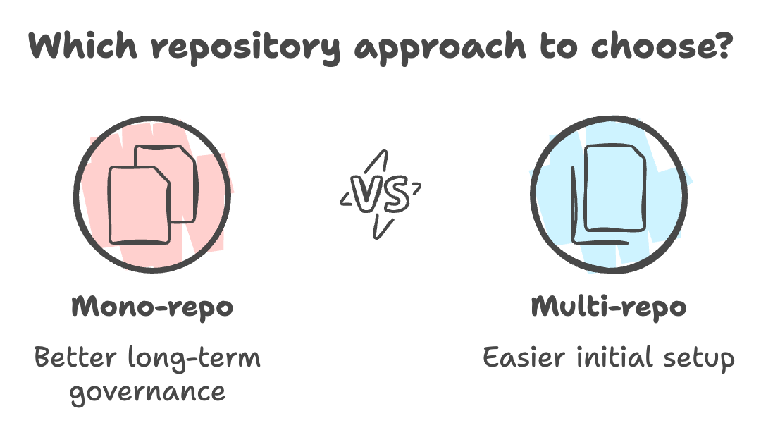 Most implementations are actually multi-repo, but that introduces overhead. Each team has their own pipeline, and the complexity of setting up governance processes, or security tooling across these pipelines becomes significant. Another scenario to consider is dependencies between services that might require specific versions to be available, these need to be planned.